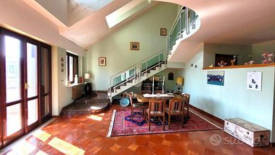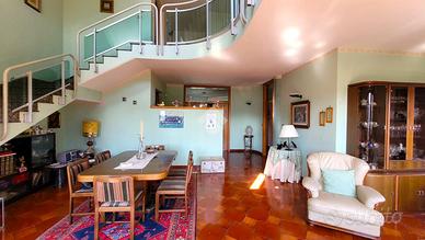 L'appartamento duplex si sviluppa su due livelli: una spaziosa e luminosa zona giorno, con un ampio soggiorno arricchito da numerosi balconi che garantiscono una vista panoramica e una grande luminosità naturale, una sala da pranzo con camino, una cucina con accesso a un terrazzo, uno studio e un bagno di servizio.
