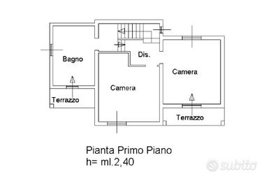 Salendo al primo piano troviamo due generose camere matrimoniali, di cui una con accesso a un comodo terrazzino, e un bagno finestrato dotato di una caratteristica vasca in muratura, con ulteriore accesso diretto a un terrazzo privato.
