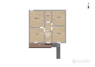 La semindipendente si sviluppa su due piani, per un totale di 100 mq e comprende:al piano terra troviamo cantina e bagno, mentre al primo piano troviamo soggiorno, cucina abitabile, due camere matrimoniali e un bagno.