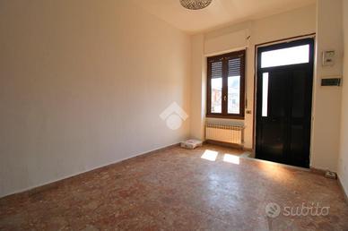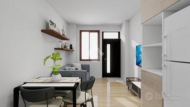Dalla scala esterna si arriva al primo piano dove vi è l'ingresso della soluzione abitativa composta dalla zona giorno, divisa in zona living e zona pranzo e la cucina semi a vista sul soggiorno.