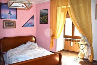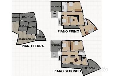 Al primo piano troviamo un trilocale luminoso e ben distribuito, composto da due camere matrimoniali, un bagno finestrato con vasca, una cucina abitabile e un accogliente soggiorno dal quale si accede al balcone, ideale per godere di uno spazio esterno privato.