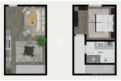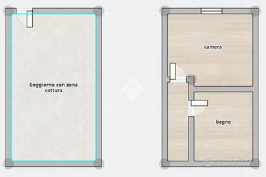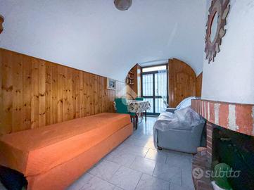 Graziosa porzione di casa terra-cielo disposta su due livelli, composta da soggiorno e cucina al piano terra e da una camera da letto matrimoniale e un servizio al primo piano.