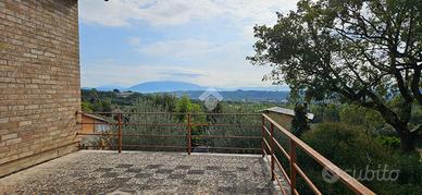 Salendo al piano superiore, scopriamo la seconda unità abitativa di circa 40 mq, con un affascinante terrazzo panoramico di circa 22 mq, da cui ammirare la vista su Assisi.