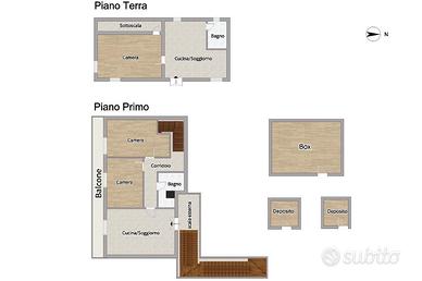 Il primo piano offre invece una maggiore articolazione degli ambienti, con due camere, cucina e bagno, creando una soluzione funzionale per famiglie più numerose.