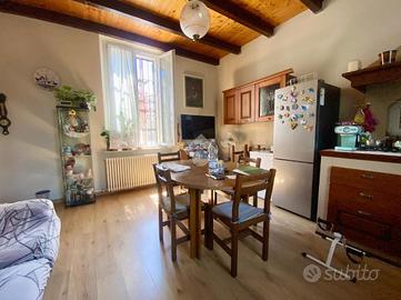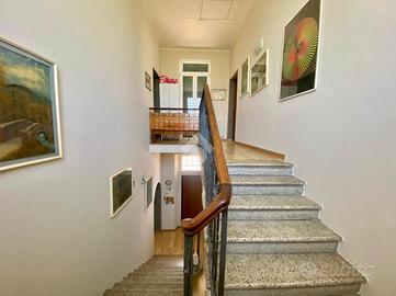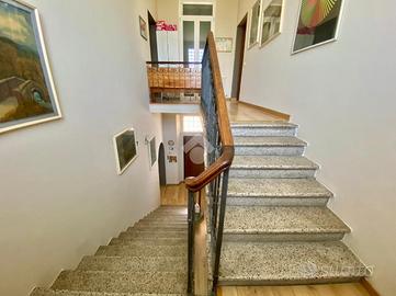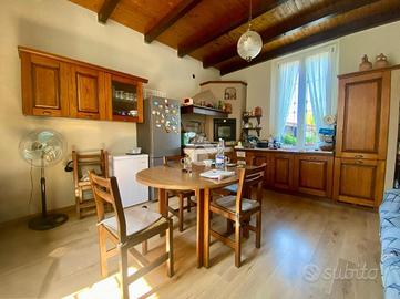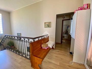 La cucina abitabile con travi in legno a vista sul soffitto, Il soggiorno, ben separato e raccolto. La scala centrale, ampia e ben posizionata, divide la zona giorno da quella notte. Al piano superiore, la zona notte si sviluppa con una camera matrimoniale ampia e luminosa, una seconda camera ideale per bambini o studio, un bagno moderno con doccia e un corridoio con affaccio sul balcone.