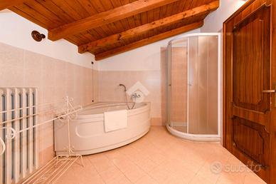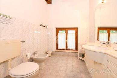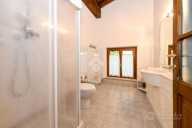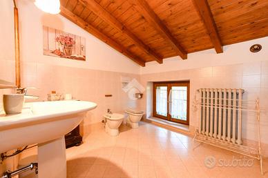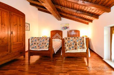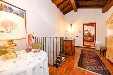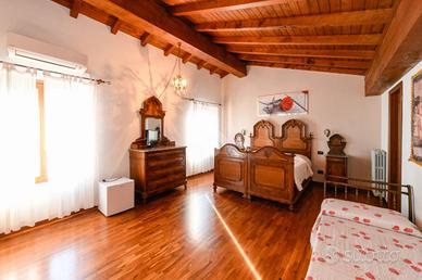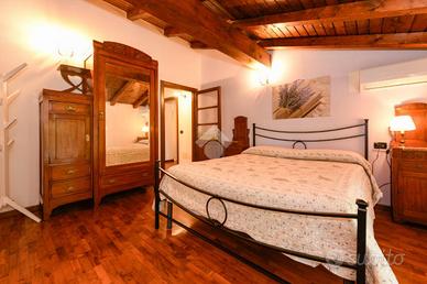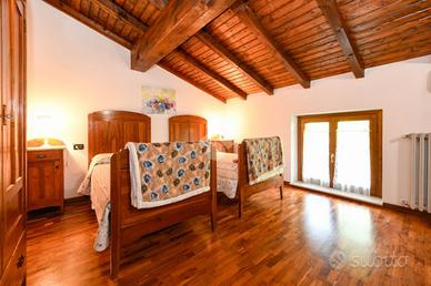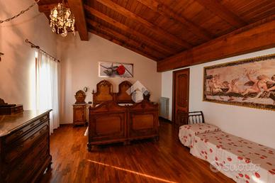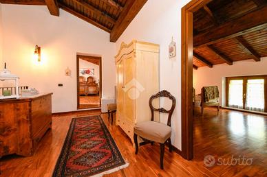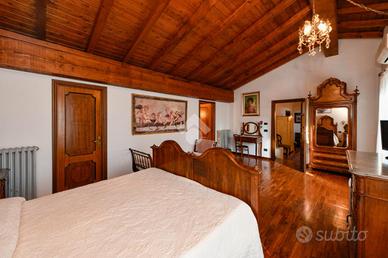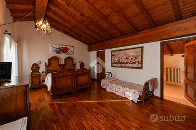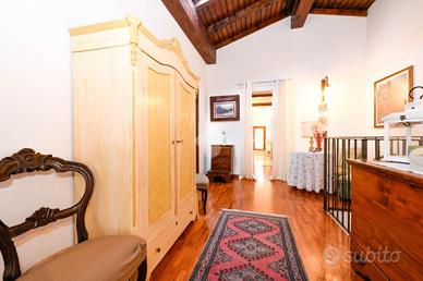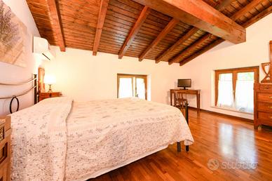 Al piano superiore tutta la zona notte si caratterizza con travi a vista in legno ed è disposta con camera matrimoniale padronale con bagno privato e cabina armadio, 2 ampie camere da letto matrimoniali, bagno.