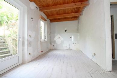 L'ingresso si apre al piano terra su un ampio locale pluriuso, versatile e adatto a molteplici esigenze: studio, sala hobby o area relax. Salendo al piano superiore tramite una scala interna, si accede all'accogliente zona giorno, un ambiente unico e arioso dove sala e cucina open space si fondono in un'atmosfera calda e conviviale. Da qui si accede direttamente al giardino privato, ideale per momenti di relax all'aperto o per ricevere ospiti nella bella stagione.