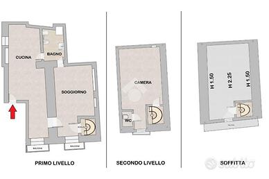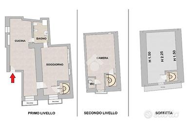 L'abitazione principale si sviluppa su tre piani. Il primo livello, raro per il centro storico, ospita più ambienti distinti: cucina, soggiorno (o eventuale seconda camera) e bagno completo rivisto nel tempo. Al secondo piano si trova una camera da letto servita da piccolo bagno. Il terzo piano è una soffitta, ideale come deposito o spazio accessorio.