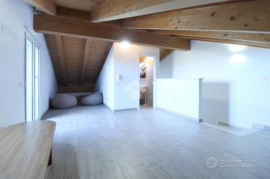 Il piano piano si apre su un soggiorno luminoso e cucina a vista con uscita sulla corte esterna e giardino; completa il piano un bagno finestrato con box doccia in vetro.