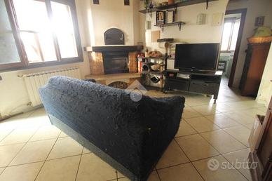 Entrando dal portone si ha la zona giorno composta da luminoso soggiorno con camino e ampia cucina abitabile.