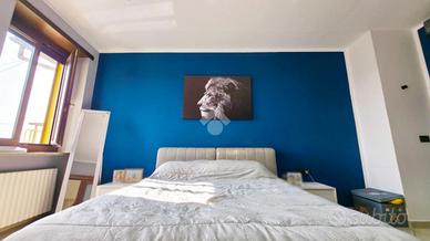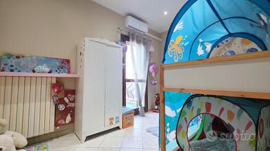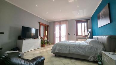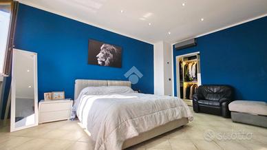 Il piano superiore comprende ben tre camere da letto e uno spazioso bagno con vasca servente al piano. La camera da letto padronale, oltre ad estendersi per una vasta metratura, viene completata da un balcone, da un bagno di servizio e da una cabina armadio completamente riservata. Le altre due stanze, invece, sono direttamente collegate al terrazzo di circa 30 metri quadrati con punto acqua, che riserva una visuale sulla pianura e sul verde collinare circostante.