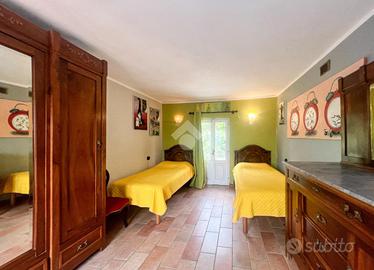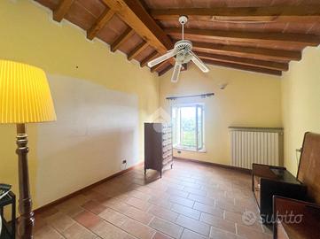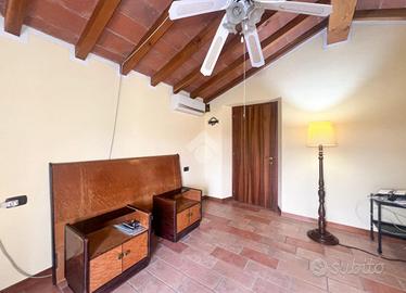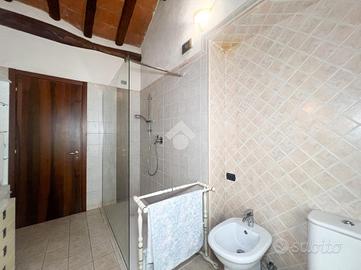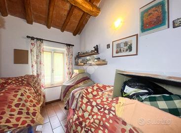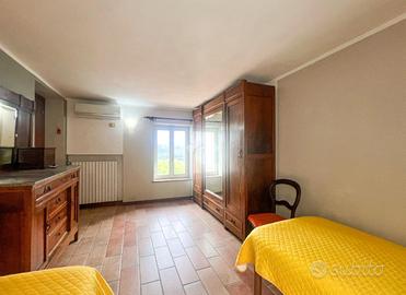 Il piano superiore, raggiungibile da scala interna, è caratterizzato da suggestive travi a vista. Qui si trovano tre camere da letto -- di cui una con balcone che si affaccia direttamente sul Castello di Santa Giuletta -- e un bagno con ampia doccia walk-in.