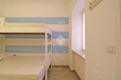 L'ingresso si apre su un'accogliente zona giorno open space, perfetta per trascorrere momenti di relax in compagnia. Un piccolo ripostiglio aggiunge praticità a questo spazio ben organizzato. Al primo piano, un bagno moderno con doccia e una camera dotata di letto a castello.