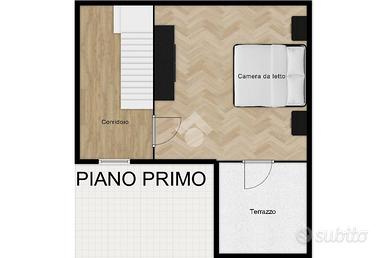 Una scala interna conduce al primo piano, dove troviamo una camera matrimoniale con accesso a un terrazzo ampio e riservato, perfetto per godere della vista sul paesaggio circostante o per allestire una zona relax all'aperto durante la bella stagione.