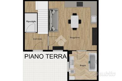 Al piano terra si trova la zona giorno, composta da soggiorno con angolo cottura e bagno finestrato dotato di vasca idromassaggio.