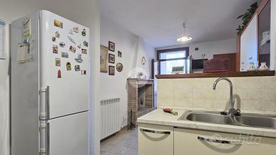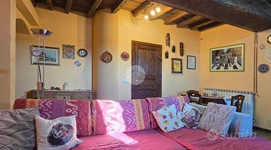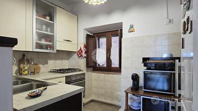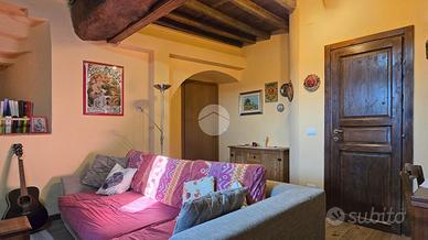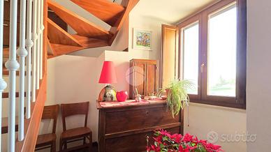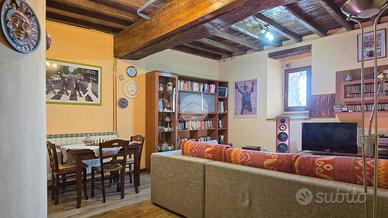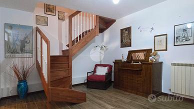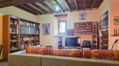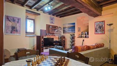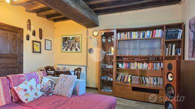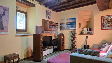 Al piano terra, un disimpegno spazioso ti porta nel salone con le autentiche travi in legno a vista: il cuore medievale della torre. Completano questo livello un bagno di servizio, un ripostiglio e una cantina pratica.