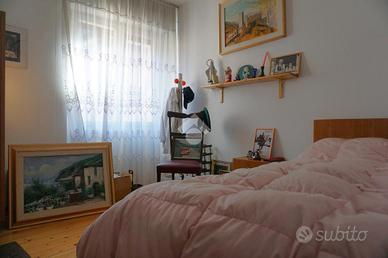 In posizione comoda e particolarmente centrale, intera porzione di casa composta da appartamento a primo piano con soggiorno-cucina, bagno, disbrigo, due stanze da letto e ampio balcone; a secondo piano ulteriori tre camere da letto, balcone, disbrigo e bagno. Sottotetto con soffitta abitabile al grezzo, oltre ad ampio garage e locali deposito con bagno a piano terra. Riscaldamento centralizzato a gas metano. Possibilità di suddivisione e vendita separata della due unità abitative: primo piano attualmente esistente e unità su due livelli (a secondo piano e sottotetto) con garage pertinenziali. No spese condominiali.