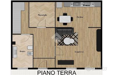 L'ingresso al piano terra conduce direttamente alla zona giorno, caratterizzata da un luminoso soggiorno con angolo cottura. A completare il piano, un ampio locale ad uso ripostiglio, perfetto come spazio aggiuntivo, e un bagno di servizio finestrato, di generosa metratura.