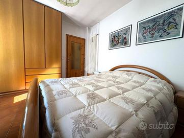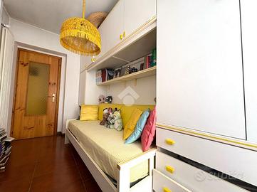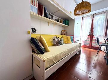 La camera matrimoniale, grazie alla doppia esposizione, offre un ambiente arioso e luminoso, con accesso al balcone condiviso con la cameretta.