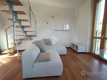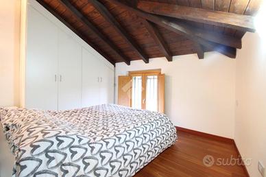 Si accede all'abitazione tramite scala esterna con ingresso indipendente. Il primo piano è composto da luminosa zona living con soggiorno, cucina a vista e balconi alla francese, che affacciano sul Fiume Adda e sul Castello Visconteo, offrendo una vista unica. La scala interna conduce al secondo ed ultimo piano con travi a vista, suddiviso in camera matrimoniale e bagno finestrato con doccia.