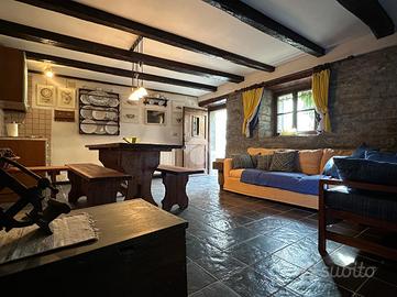 Al piano inferiore si trova un' ampia taverna con cucina, caminetto e collegamento diretto al piano abitativo.