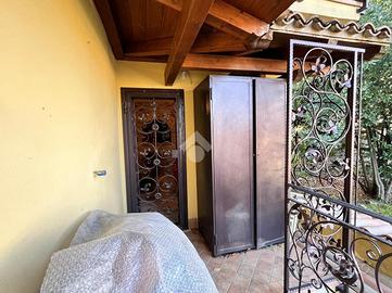 L'ingresso si apre su una zona giorno accogliente composta da una cucina su misura con salottino annesso e un primo bagno di servizio, ideale per gli ospiti. Proseguendo troviamo un ampio soggiorno caratterizzato da un camino che dona calore e atmosfera all'ambiente, con accesso diretto a un balcone esterno, perfetto per momenti di relax all'aperto.