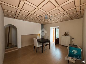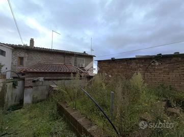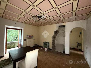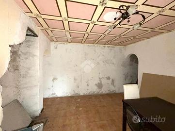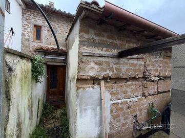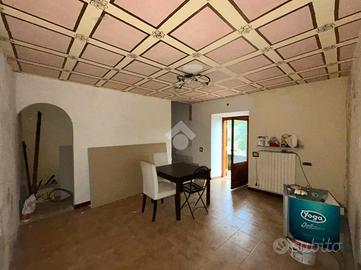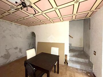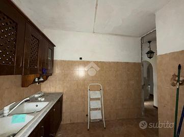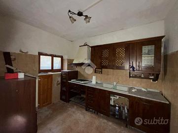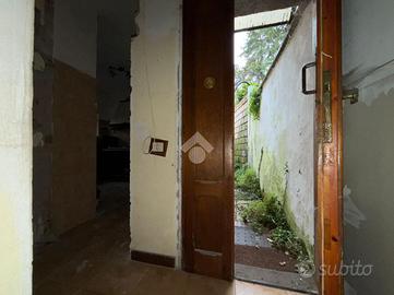 Una breve scalinata ci conduce all'ingresso della soluzione di 60 mq che si sviluppano su due livelli. Al nostro ingresso attualmente troviamo cucina semi abitabile, bagno finestrato e salottino con predisposizione per il camino. Da qui si ha il secondo accesso alla casa dalla parte retro della struttura.