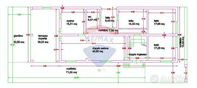Dei due ingressi, uno di fronte all' altro, il primo a sinistra immette in un triplo salone, facilmente divisibile secondo le varie esigenze, comunicante con una ampia terrazza coperta di 3O metri quadri, ombreggiata d' Estate da due alberi, che d' inverno spogliano lasciando passare, gradevolmente i raggi del sole, e che si affaccia sul Parco della Villa comunale.