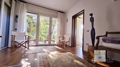 La zona notte comprende una camera matrimoniale principale con bagno adiacente ed armadiature a muro perfettamente integrate nell'arredo; vi è inoltre un'ala indipendente composta da camera da letto con zona lounge, bagno, suggestiva e luminosa zona giorno con con studio, sapientemente posizionato per godere al massimo della visuale sul giardino dalle ampie vetrate. Quest'ultima è già utilizzabile come bilocale autonomo - soluzione ideale sia per ospiti che per studio privato o seconda unità familiare.