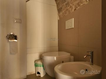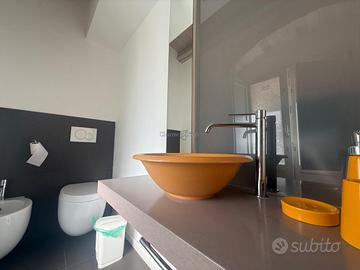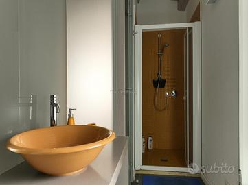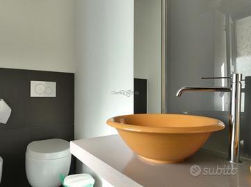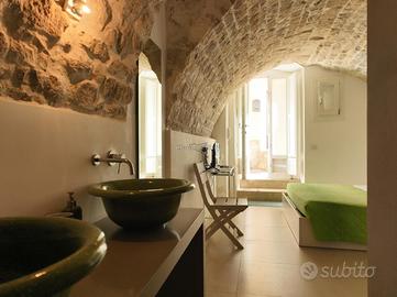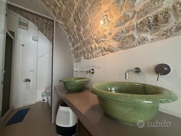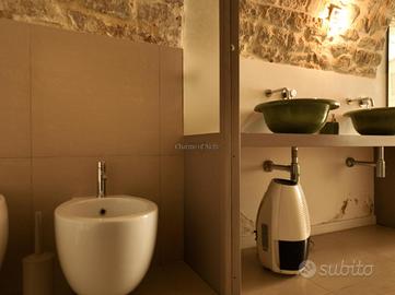 *Due bagni di design, realizzati da artigiani e architetti, con sanitari sospesi e lavabi ricavati da lemmi tipici della zona.