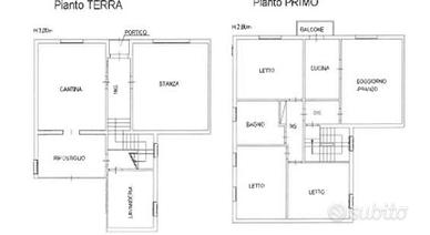 Abitazione sviluppantesi su due piani, composta da portico, ingresso, cantina, ripostiglio, stanza e lavanderia al piano terra; due disimpegni, soggiorno, cucina con balcone, tre camere e bagno al piano primo.