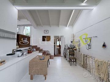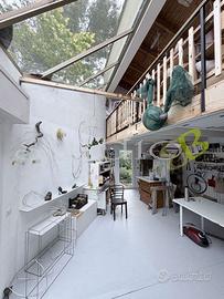 Il secondo corpo di fabbrica offre volumi generosi con una superficie di circa 30 mq al piano terra e ulteriori 20 mq situati su un piano mezzanino, dove l'altezza interna raggiunge i 5 metri sulla sommità più alta permettendo la presenza di un soppalco inondato di luce grazie ad un ampio lucernario a soffitto.
