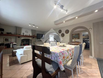 al piano terra il disimpegno d'ingresso affaccia su una zona giorno completamente ristrutturata, organizzata tra salotto e cucina abitabile a vista. Protagonista il camino, che occupa quasi per intero una parete; con inserto in monoblocco, è avvalorato dalla struttura esterna in mattoncino ed è dotato di una base d'appoggio e di una trave in legno che funge da mensola, il che lo rende un vero e proprio elemento d'arredo.