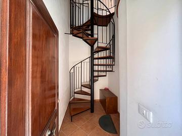 All'appartamento al primo piano accediamo tramite scala a chiocciola posta su ingresso indipendente, ed è a sua volta composto da cucina soggiorno, bagno, camera da letto e cameretta con terrazzo di 12mq circa.
