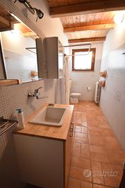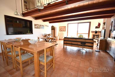 Entrandovi siamo accolti da un delizioso salone con camino: un ambiente che si distingue anzitutto per la grande luminosità. Caratteristica, quest'ultima, favorita dalla presenza di una ampia porta finestra che consente l'accesso alla corte esterna e al tempo stesso offre una bellissima vista sulle colline. Nel salone troviamo anche un grazioso soppalco che dona ulteriore personalità all'immobile.