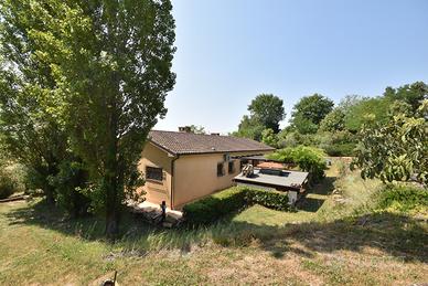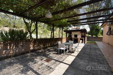 Venendo agli accessori, la casa dispone anche di un comodissimo garage di 45 mq. Il tutto è completato dal grande punto di forza di questa abitazione: gli spazi esterni. La corte esclusiva si estende per 4.000 mq e fa da cornice all'intera proprietà, rappresentandone la vera essenza. Ad essa si aggiunge poi un terreno di ben 42.000 mq, che comprende un bosco e un uliveto composto da 550 piante di ulivo.