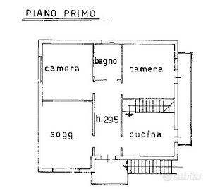 Al primo piano accessibile anche da scala esterna prendono posto le due camere matrimoniali, soggiorno con cucina separata e bagno finestrato con vasca.