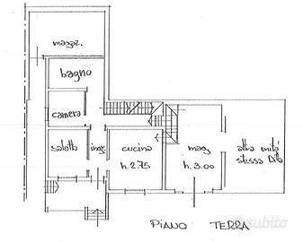 L'immobile è composto al piano terra da una zona giorno con cucina separata di 30 mq, studio di 7 mq, bagno finestrato con vasca di 8 mq e magazzino di 24 mq.