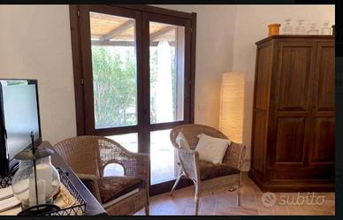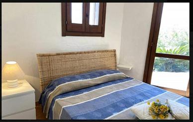 L'abitazione, dallo stile tipicamente mediterraneo, presenta facciate bianche, tetto con tegole tradizionali e infissi in legno che conferiscono calore ed eleganza agli ambienti. Gli spazi interni risultano luminosi e accoglienti grazie alle ampie aperture che collegano direttamente la zona giorno al patio esterno. Il soggiorno, con angolo cottura, è valorizzato da arredi curati e materiali naturali come cotto e legno, creando un'atmosfera autentica e rilassante.