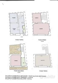 L'abitazione è composta al piano terra dal soggiorno con cucina a vista, bagno di servizio, locale ripostiglio; scala interna di collegamento ai piani superiori con ampio e luminoso secondo soggiorno, camera e bagno; piano terzo composto da una camera + terrazzino autonomo.