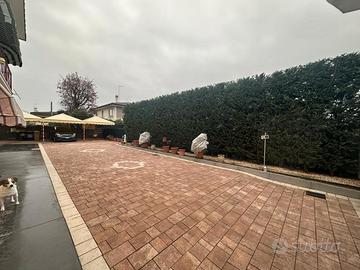 La proprietà è circondata da circa 400 mq di giardino pavimentato con mattonelle, ideale per momenti di relax, area gioco o convivialità all'aperto.