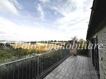 Piano terra: ingresso, ampio salone con accesso al giardino, zona living con arco e camino in muratura, cucina abitabile in muratura con ripostiglio ed accesso al verdeggiante e colorato giardino attrezzato di barbecue e forno a legna;Piano ammezzato: ulteriore ripostiglio e bagno con doccia, entrambi finestrati. Accesso al giardino tramite balaustra con scala esterna.Piano primo: n. 3 stanze da letto di cui una con accesso ad un balcone, ampio soggiorno, pratica lavanderia e secondo bagno finemente rifinito con vasca.Piano secondo: accogliente disimpegno, ampio openspace totalmente coibentato, con accesso al solarium attrezzato, esposto su 3 lati, con splendida vista sulle colline del territorio fermano, ulteriore bagno con sanitari sospesi.L'immobile è dotato di riscaldamento autonomo con suddivisione in 2 distinte zone, di un locale tecnico con caldaia a condensazione, di una legnaia con magazzino, di un cancello con accesso carrabile e predisposizione all'apertura automatica, oltre che di un ampio garage per il parcheggio di due autovetture.