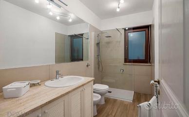 Un bagno ristrutturato con tutti i comfort possibili, lavatrice box doccia, specchio e servizi sanitari.