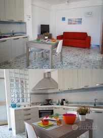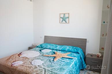 E' costituito da due camere da letto, cucina-soggiorno con divano letto a due piazze, 2 bagni (uno interno e uno esterno). Ampia veranda con tavolo, sedie e ombrellone. Ogni ambiente è dotato di ampie finestre con vista mare.