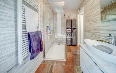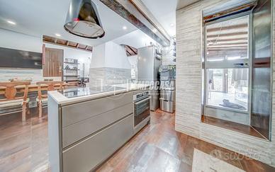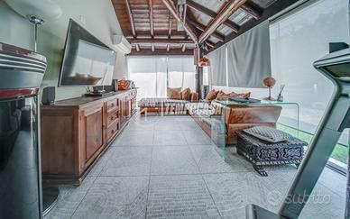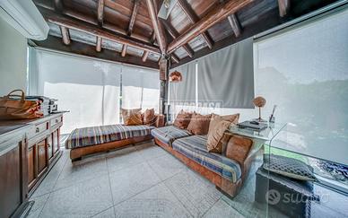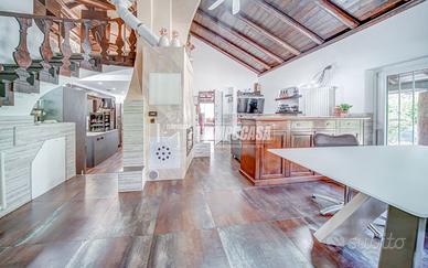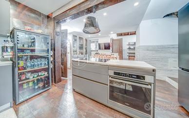 * Zona giorno luminosa con soggiorno e cucina a vista, affacciata su una delle due verande vetrate con vasca idromassaggio, perfetta per momenti di relax con vista sul giardino