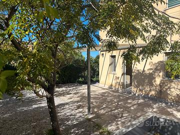 Ampio spazio esterno in parte curato a giardino con alberi ornamentali da frutto e in parte pavimentato.