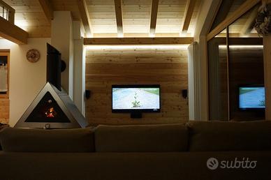 Al centro della zona giorno troviamo la canna fumaria per un caminetto di design, ideale per arredare e riscaldare tutto il piano nelle fredde giornate invernali, mentre l'ampia vetrata offre uno spettacolare paesaggio innevato e illibato di fronte a questa stupenda soluzione singola a Falcade.