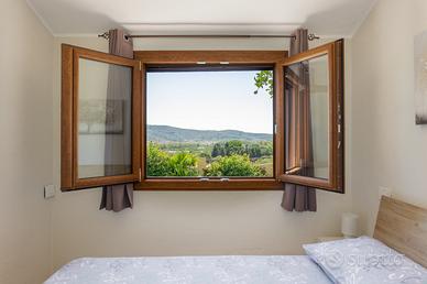 La camera da letto matrimoniale offre una vista incantevole sulle colline verdi, la cameretta con due letti singoli offre praticità mentre il bagno, moderno e raffinato, è pensato per offrire ogni comfort. Ogni ambiente è studiato per accoglierti con calore e funzionalità, rendendo ogni momento vissuto qui un'esperienza indimenticabile.