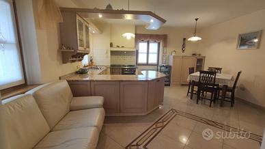 La casa prevede un giardinetto d'ingresso verso la zona giorno, che è costituita dall'ingresso sulla ampia zona giorno, e da un antibagno e bagno finestrato con doccia; spiccano gli arredi di qualità e su misura, in particolare la splendida cucina dotata anche di stufa a legna, che rimangono a beneficio dell'abitazione, compresi nel prezzo di vendita.