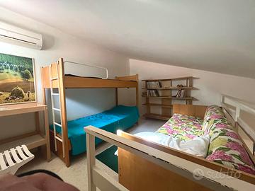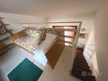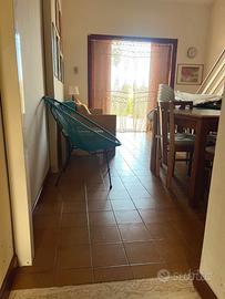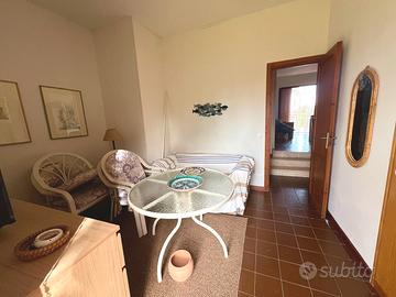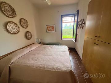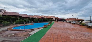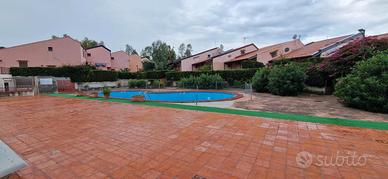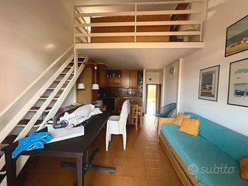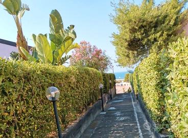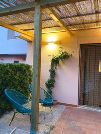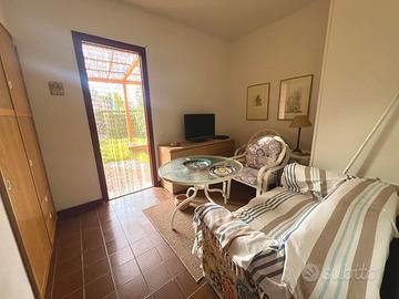 All'interno dell'esclusivo Residence "Le Palme" con piscina condominiale, proponiamo in vendita deliziosa casetta totalmente arredata - a soli 100 metri dalla discesa al mare "Le Palme" e 200 metri dalla Darsena. La proprietà gode di doppi ingressi indipendenti (lato piscina e lato garage) ed è circondata da spazi esterni privati mq. 45 c. a. , suddivisi in giardino mq. 30 e terrazzo mq. 15, ideali per momenti di relax all'aperto. L'abitazione si presenta accogliente ed è composta da: oingresso su soggiorno intimo e luminoso, ocamera da letto matrimoniale, oopen space con angolo cottura, obagno oulteriori 2 posti letto, perfetto per ospiti o famiglia. Immobile provvisto di portierato, doppia esposizione con scorcio vista mare, garage incluso nella vendita, climatizzatore nel soppalco, scaldabagno elettrico, buono stato generale, libera e immediatamente disponibile.